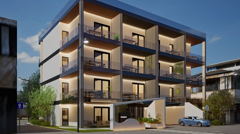 On Thessaloniki’s outskirts, Skywell Homes sits on a quiet street with quick links into the city. Setback balconies and tall windows bring in light while keeping interiors private.